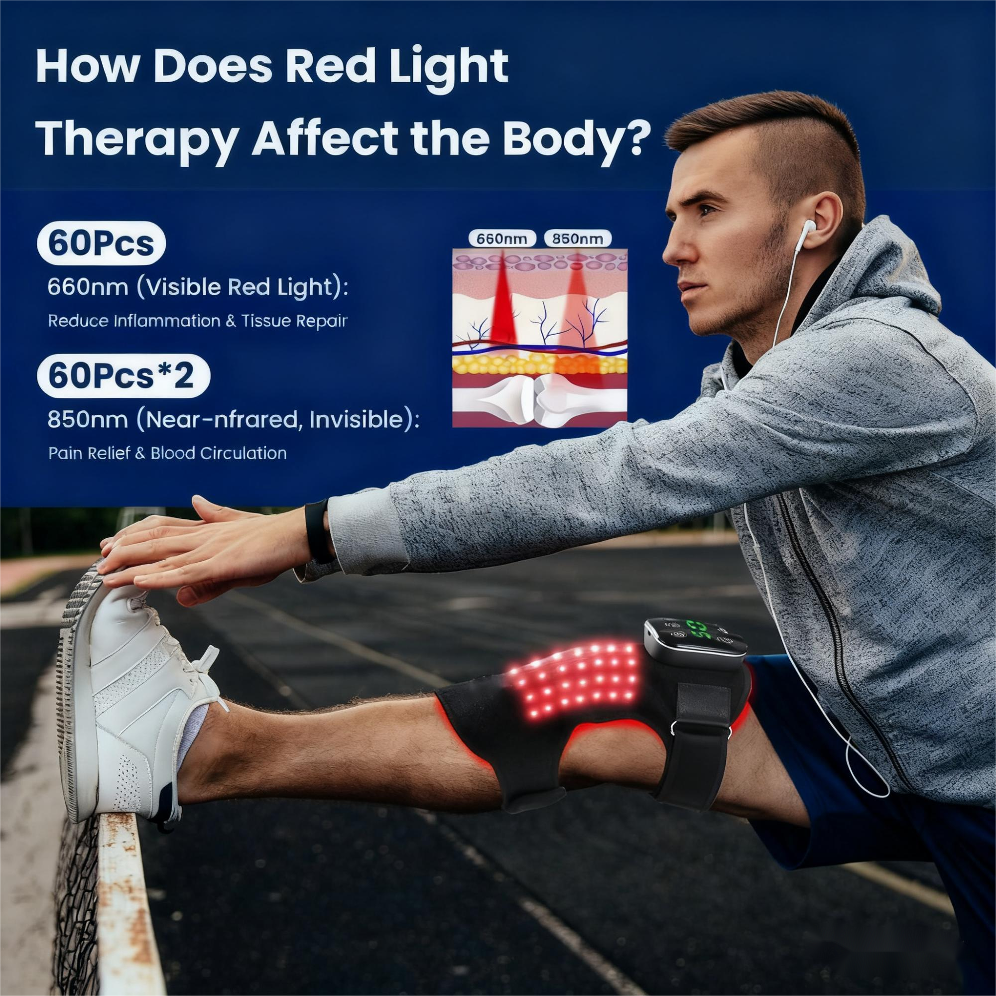 The Solun Red Light Therapy Knee Brace combines 660nm red light and 850nm near-infrared light to penetrate deep into muscles and joints. These wavelengths are clinically shown to reduce inflammation, accelerate tissue repair, and enhance circulation — perfect for arthritis, knee strain, or post-workout soreness.